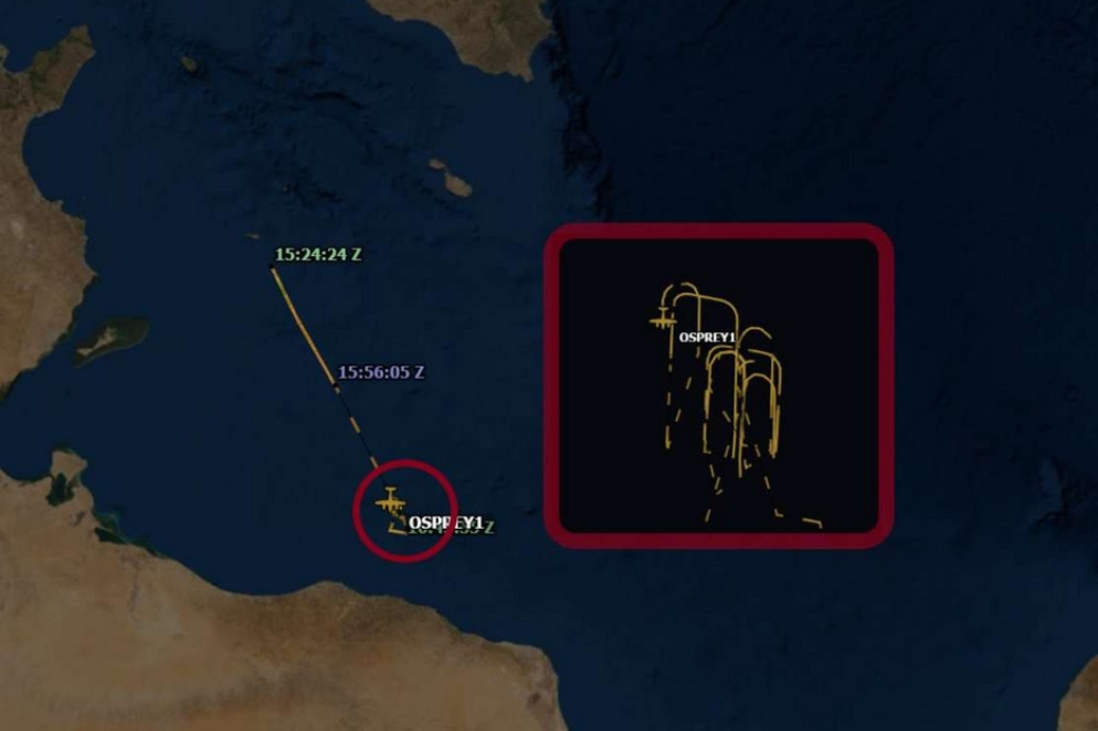 Ore 19:15. “Abbiamo informato le autorità che le persone in difficoltà potevano vedere un aereo, che riteniamo fosse l'aereo di Frontex Osprey”. La traiettoria del volo di sorveglianza europeo è stata registrata dal giornalista Sergio Scandura, di Radio Radicale, come mostra la mappa qui di seguito.