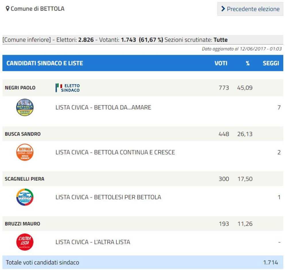 Tre nuove nomine e una riconferma. A Bettola il nuovo sindaco è Paolo Negri, che con il 45.1% ha sbaragliato i concorrenti: Sandro Busca, sindaco uscente, che ha ottenuto il 26,1%, e poi Piera Scagnelli e Mauro Bruzzi fermi rispettivamente al 17.5% e 11.3%. A Carpaneto la vittoria va ad Andrea Arfani che con il62.2% ha stravinto su Anna Buonaditta che ha ottenuto il 37.8%. A Monticelli la poltrona di primo cittadino è andata, con il 60,3%, a Gimmi Distante contro il 39.7% di Pietro Aimi.