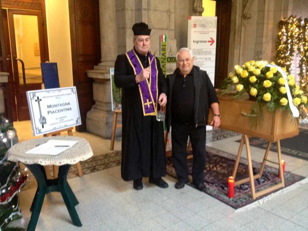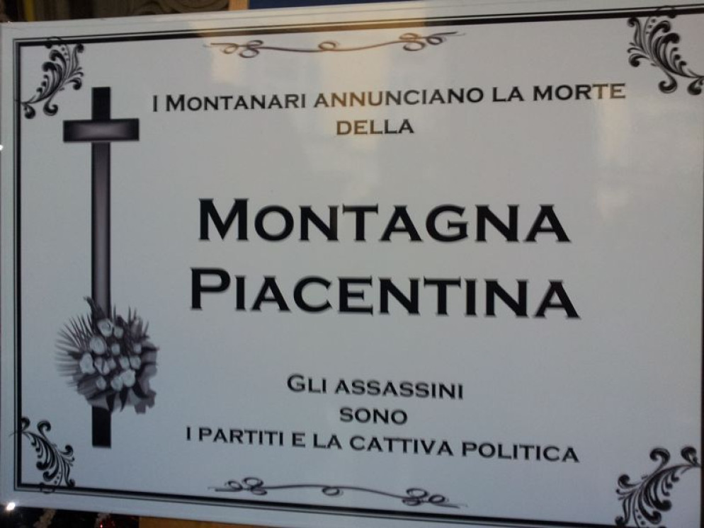 Fuori dal palazzo della Provincia, in corso Garibaldi, è stata allestita una finta camera mortuaria in perfetto stile: candele, una bara in legno chiara, rose gialle e una scritta chiara, con accuse pesanti. “La politica ha ucciso la montagna”. Il funerale della montagna è stato organizzato dal consigliere provinciale del gruppo misto di minoranza Bruno Ferrari, alla presenza di un gruppo di cittadini dell’alta Valnure, di un finto monsignore e di un becchino.