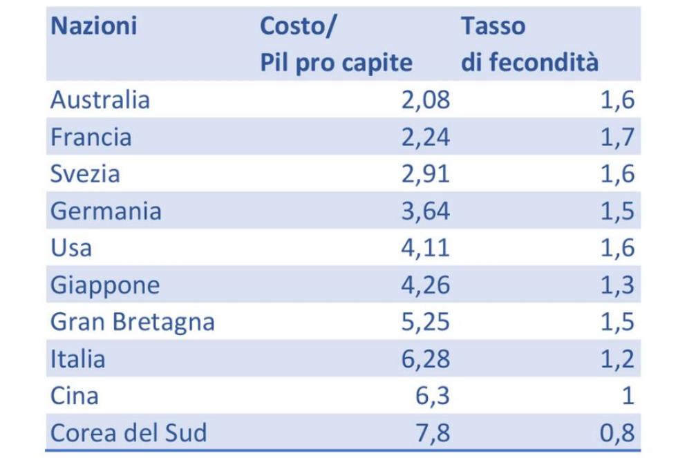 Nel rapporto, di non facile consultazione perché scritto in sinogrammi, è tuttavia contenuto un confronto internazionale dal quale emerge che l’Italia contende alla Cina il secondo posto come nazione dove il costo del mantenimento di un figlio dalla nascita ai 17 anni è più gravoso in relazione al Pil pro capite. Dunque, se in Corea del Sud, che con circa 0,8 figli per donna è il Paese col tasso di fecondità più basso al mondo, portare un figlio fino alla maggiore età richiede una spesa pari a 7,8 volte il Pil pro capite, in Cina questo costo arriva ammonta 6,3 volte, poco più dell’Italia, il cui valore risulta di 6,28.