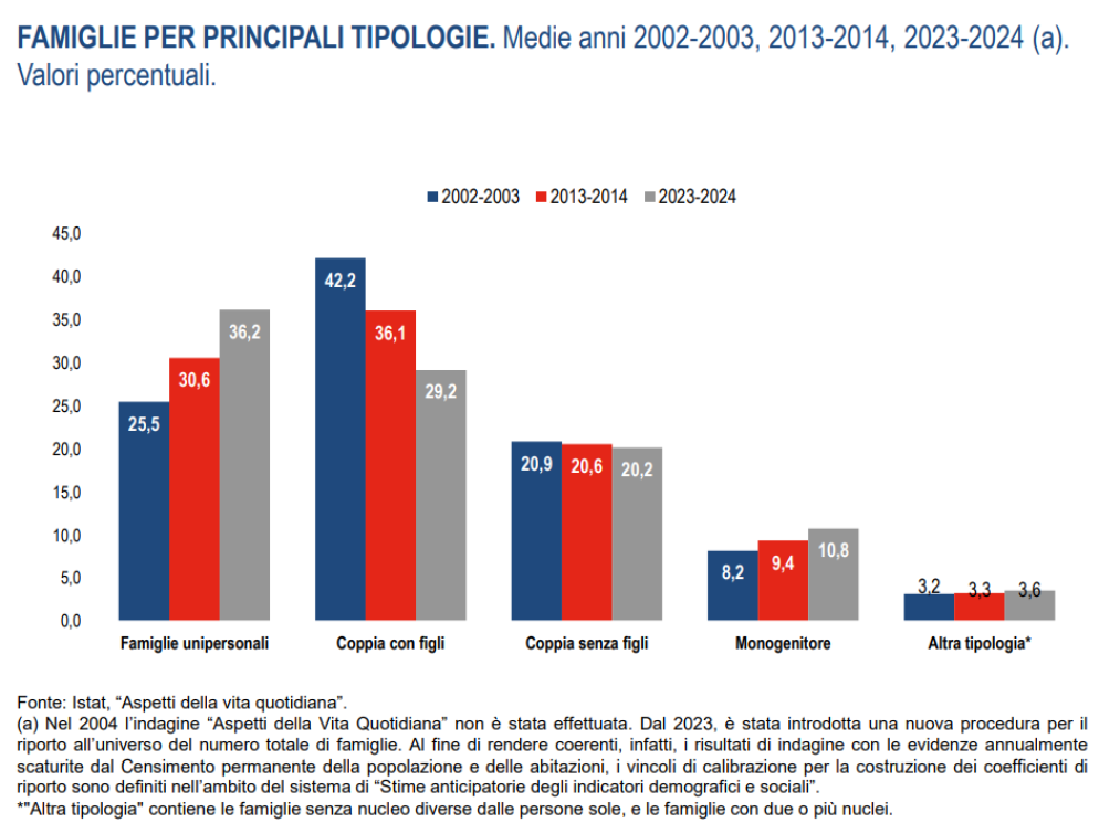 Famiglie ristrette: più di un terzo è fatta da una sola persona. Strettamente collegato al crollo delle nascite è la frammentazione delle famiglie: oltre un terzo è formato da una sola persona (il 36,2%), era un quarto ai primi anni Duemila. Il sorpasso sulle coppie è avvenuto nell'ultimo decennio e oggi le famiglie con figli sono appena il 29,2% (alle quali va aggiunta la quota di famiglie monogenitoriali pari al 10,2%), quelle senza figli il 20,2%. Le famiglie composte da almeno un nucleo, in cui cioè è presente almeno una relazione do coppia o genitoriale sono il 61,3%. Nonostante le differenze territoriali, maggiore concentrazione di single e coppie senza figli al Nord e nel Centro) le famiglie si sono ristrette ovunque: oggi sono composte in media da 2,2 componenti.