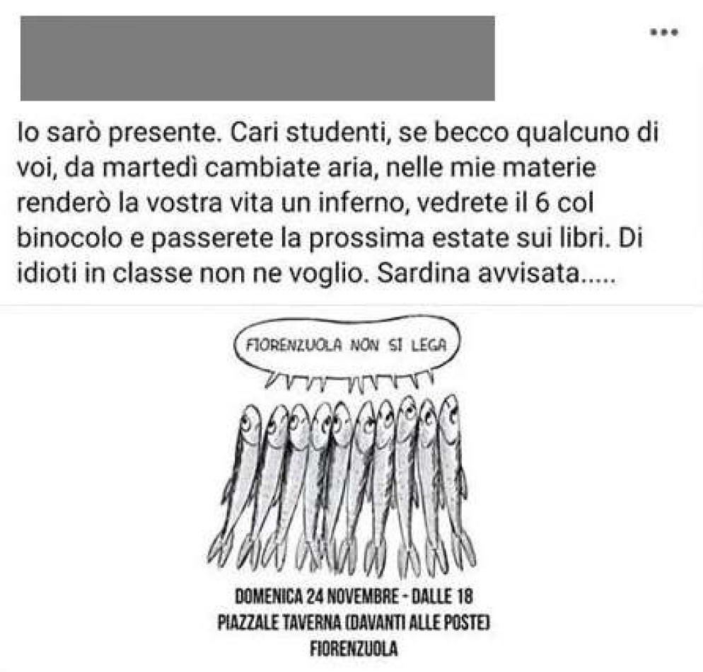 Scoppia un caso a Fiorenzuola che fa tremare la scuola. Il professore dell’istituto superiore Mattei avrebbe minacciato di bocciare i suoi studenti se domani, 24 novembre, dovessero manifestare con il “Movimento delle sardine” contro Matteo Salvini: “Io sarò presente. Cari studenti, se becco qualcuno di voi, da martedì cambiate aria, nelle mie materie renderò la vostra vita un inferno, vedrete il 6 col binocolo e passerete la prossima estate sui libri”.