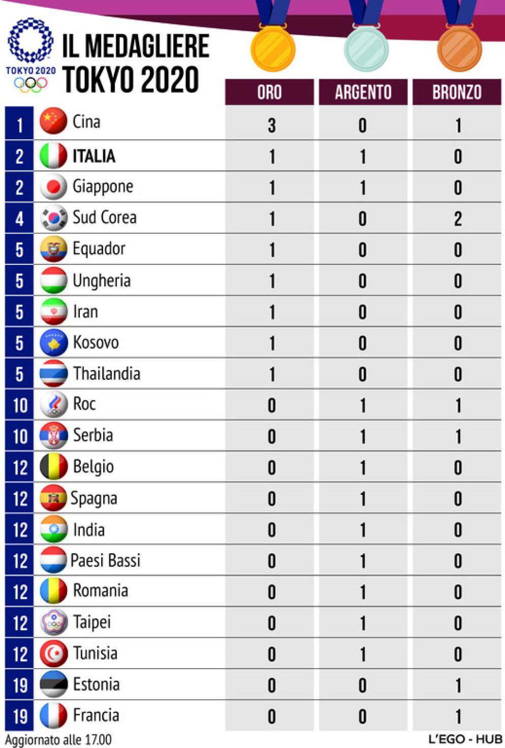 Il Medagliere. Per l'Italia un oro e un argentoRedazione Online07/23/2021Ansa | Primo oro per l'Italia. Vito Dell'Aquila ha vinto nel taekwondo 58 kgTagTokyo 2020;