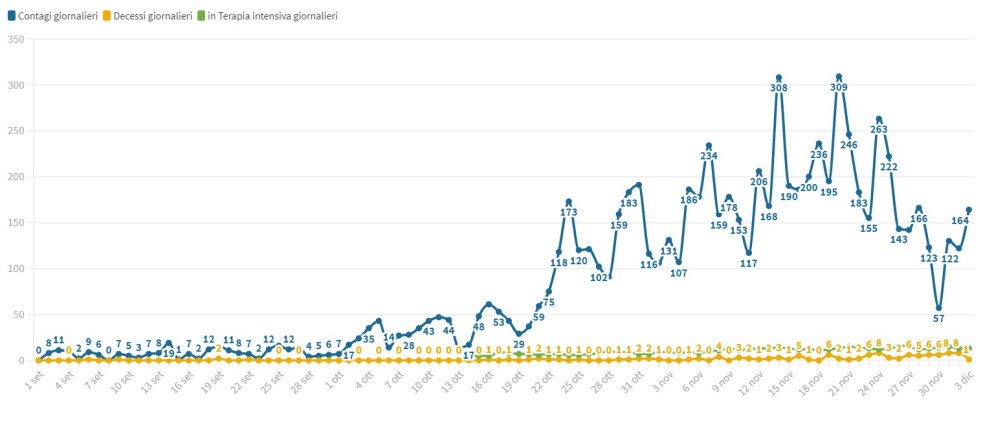 Dopo l’impennata dei giorni scorsi, fortunatamente torna basso il livello di decessi da Covid nella nostra provincia. Oggi una sola vittima (una donna di 99 anni), a cui si sommano 164 nuovi contagiati, dei quali solo 72 con sintomi.