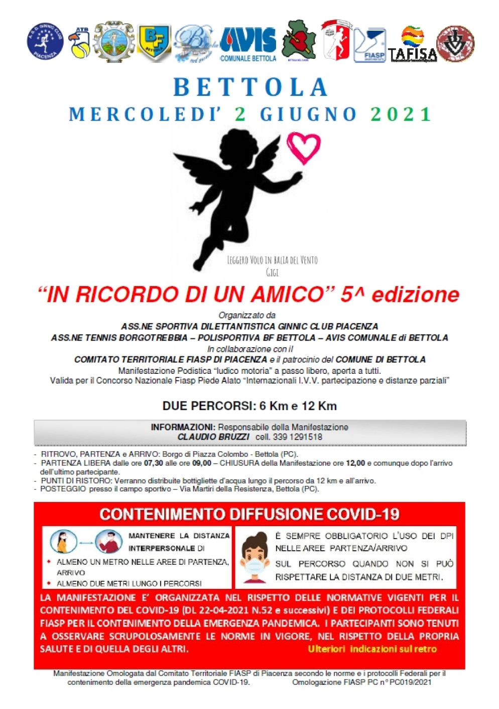 La manifestazione sportiva, a passo libero e aperta a tutti, si svolgerà in forma ridotta rispetto agli anni passati, attraverso due percorsi da sei e da 12 chilometri. Ritrovo, partenza e arrivo saranno in piazza Colombo, a Bettola. Obbligatorio l’uso della mascherina nelle aree comuni, e sul percorso quando non si può rispettare la distanza di due metri l’uno dall’altro. I posteggi saranno allestiti nel campo sportivo in via Martiri della Resistenza.