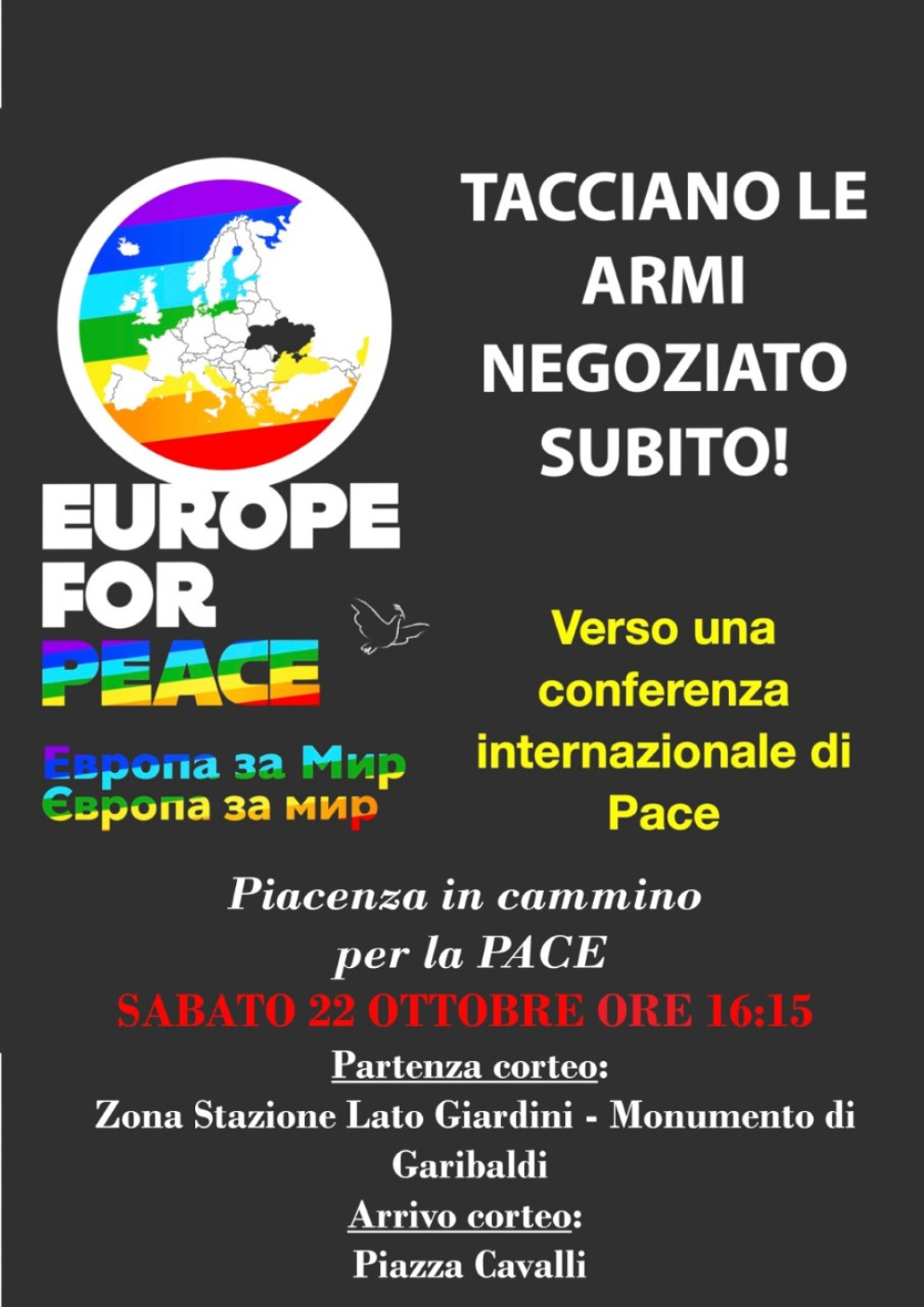 Anche a Piacenza l’appello è stato accolto e decine di associazioni si sono mobilitate per organizzare la manifestazione “Piacenza in marcia per la Pace” che si terrà sabato 22 ottobre – ritrovo previsto alle 16.15 davanti ai giardini della stazione, lato monumento a Garibaldi – dove partirà il corteo che si concluderà in Piazza Cavalli. I promotori si aspettano un ampia partecipazione e invitano a intervenire esclusivamente con bandiere della pace o striscioni e cartelloni analoghi. Non sono ammesse, invece, bandiere o simboli di partito.