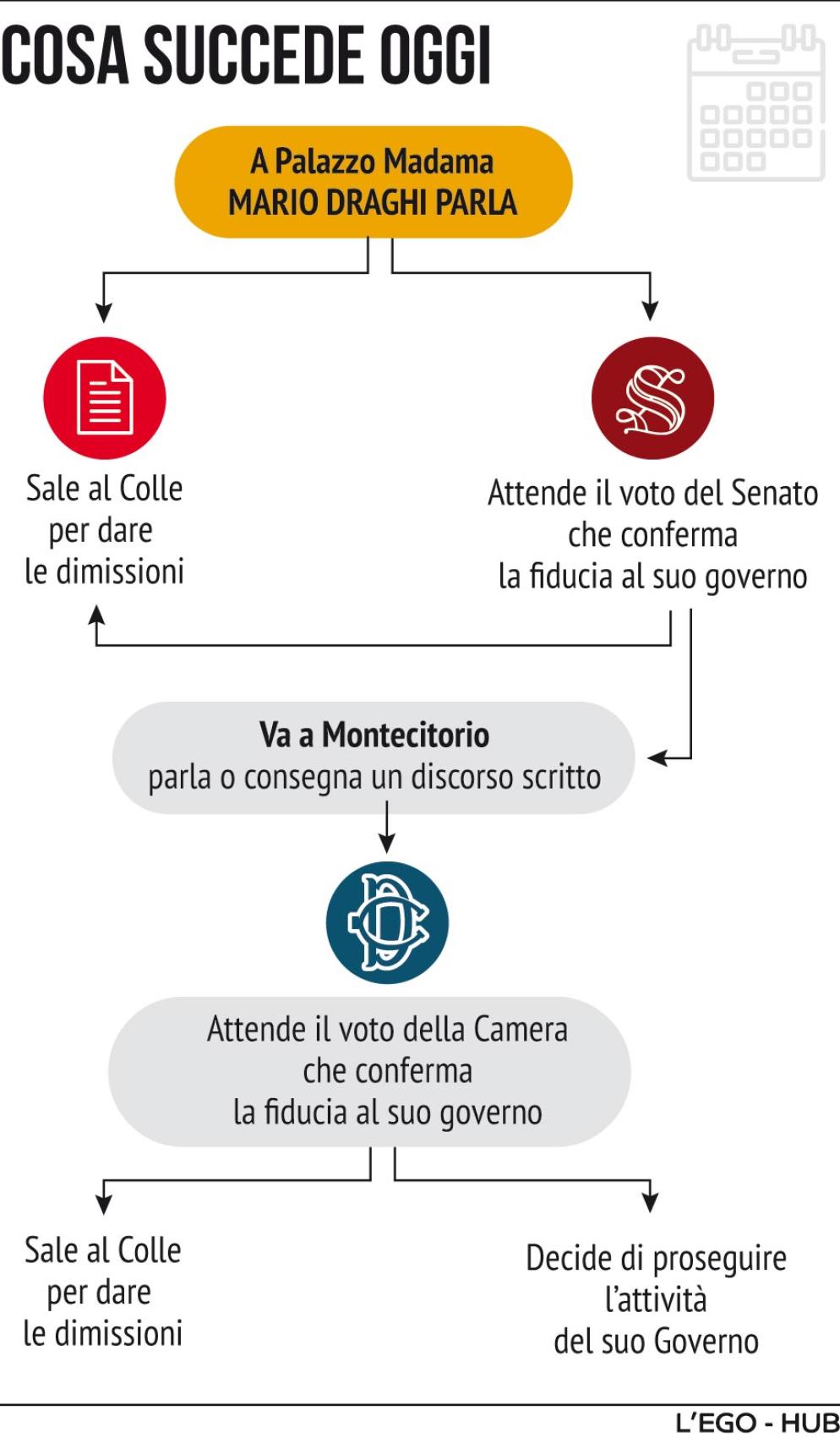 Alla fine di una giornata lunghissima è arrivata la fiducia al governo al Senato, ma senza il voto di Forza Italia, Lega e M5s. Così la maggioranza che sosteneva Mario Draghi si è dissolta. I 95 voti a favore a Palazzo Madama sono troppo pochi. Il premier domani mattina, alle 9, sarà alla Camera come previsto. Poi salirà al Quirinale. Secondo alcune agenzie di stampa, Draghi non vorrebbe aspettare il voto di fiducia a Montecitorio, ma andrebbe direttamente a rassegnare le dimissioni dal Presidente della Repubblica.
