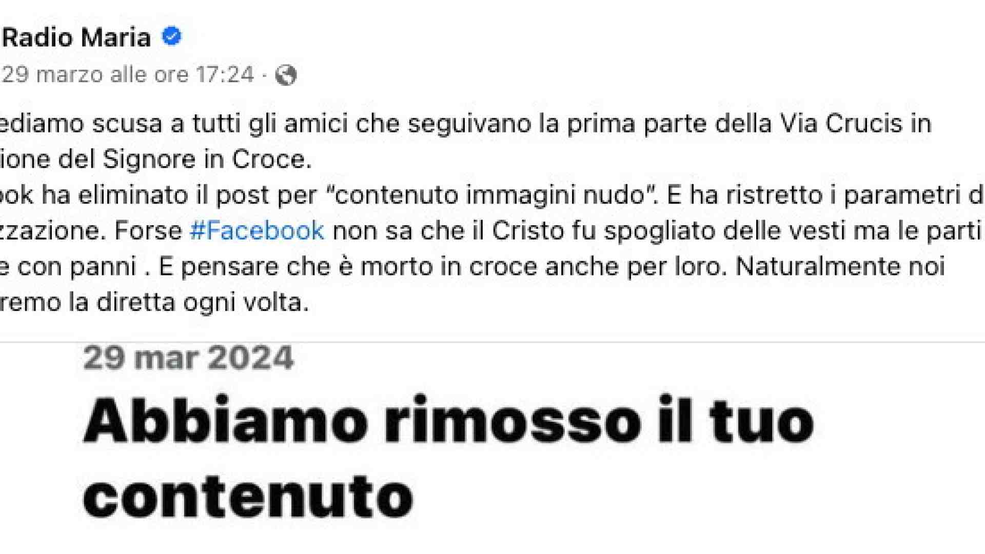 Padre Livio Fanzaga ha preso piuttosto allegramente la scoperta che, il venerdì santo, l’algoritmo gli abbia censurato l’immagine di un crocifisso sui canali social di Radio Maria: non perché lesivo dell’equilibrio inclusivo fra religioni, non perché avrebbe dovuto accontentare tutti mostrando anche immagini di Maometto, di Budda e della Dea Ragione; bensì perché il crocifisso è a petto nudo. Singolare circostanza, ha commentato il prelato, dato che i social censurano sì il petto nudo femminile ma non quello maschile, ad esempio nelle foto al mare: si vede che l’algoritmo è stato tratto in inganno dai capelli lunghi, chissà.