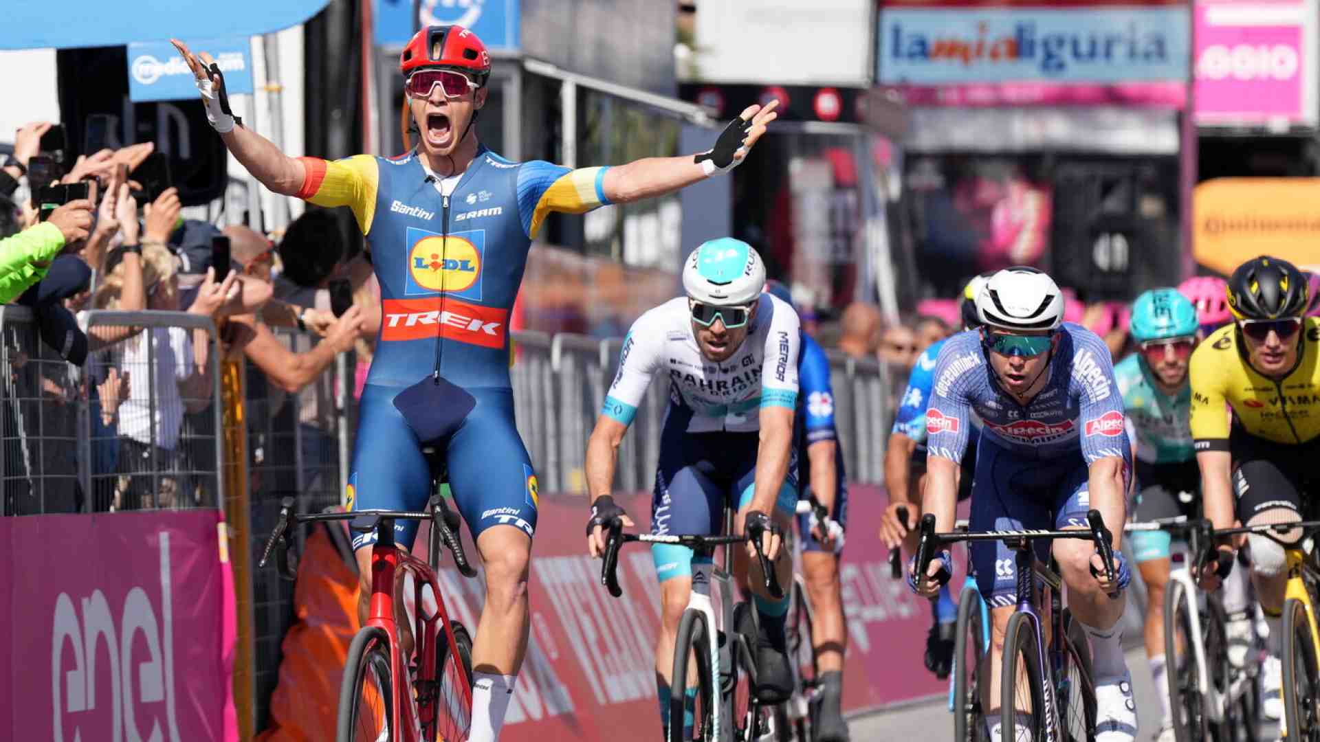 Ogni inseguimento però ne richiama un altro. E se si inizia a consideralo termine da pistard, non si può smettere certo a mezzo chilometro dal traguardo. O così deve aver pensato Jonathan Milan che si è fiondato velocissimo fuori dalla scia del suo pesce pilota, ha preso quella di Christophe Laporte per qualche istante, ha fatto un po’ a spallate con Olaf Kooij, prima di trovare la via direttissima per superare per primo lo striscione d’arrivo. Primo. Prima vittoria a questo Giro d’Italia. Primo sorriso a tutta bocca.