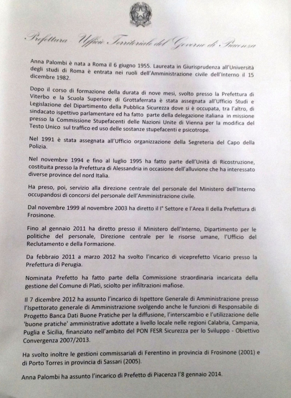 Anna Palombi entra in servizio oggi a Piacenza. E’ nata a Roma nel 1955, è laureata in Giurisprudenza. Nella sua carriera ha svolto diversi ruoli nelle amministrazioni pubbliche e, tra le altre, ha fatto parte della commissione incaricata della gestione del comune di Platì sciolto per infiltrazioni mafiose.