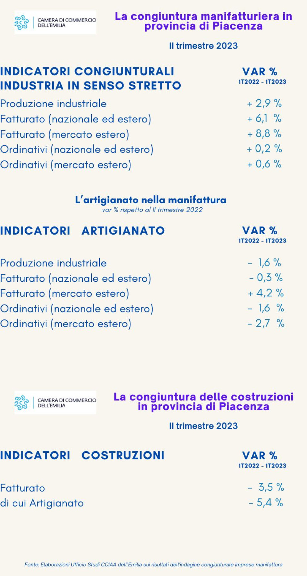 A completare il quadro della manifattura piacentina giunge un dato leggermente negativo anche per le costruzioni: a fronte della stabilità registrata a livello regionale, il fatturato provinciale di settore ha infatti perso il 3,5% rispetto al dato del secondo trimestre 2022.