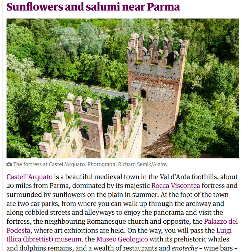 “Castell’Arquato- scrive la lettrice del Guardian- è un bellissimo borgo medievale nella Pedemontana della Val D’arda a circa 20 km da Parma, dominato dalla sua maestosa Rocca Viscontea e circondato dai girasoli in pianura in estate. Ai piedi del paese – prosegue nella recensione- si trovano due parcheggi, da cui si può salire a piedi attraverso l’arco e lungo strade acciottolate e vicoli per godersi il panorama e visitare la rocca, la vicina chiesa romanica e, di fronte, il Palazzo del Podestà, dove si tengono mostre d’arte. Lungo il tragitto, passerete davanti al museo Luigi Illica (librettista), al Museo Geologico con i suoi resti preistorici di balene e delfini, e una serie di ristoranti ed enoteche dove assaggiare salumi e il vino rosso locale, il gutturnio o l’ortrugo bianco”.