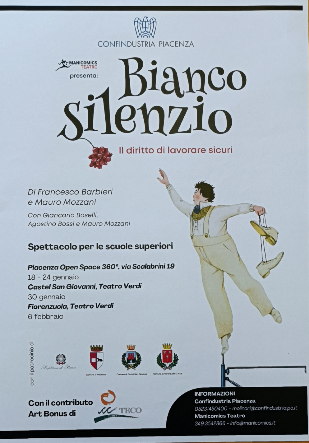 La compagnia Manicomics Teatro e Confindustria Piacenza hanno presentato lo spettacolo “Bianco silenzio: il diritto a lavorare sicuri”, un’iniziativa dedicata al tema della sicurezza sul lavoro e supportata dall’azienda Teco di Fiorenzuola. Il testo di Mauro Mozzani e Francesco Barbieri, che verrà proposto su vari palcoscenici di Piacenza e provincia, si rivolge agli studenti delle scuole superiori. Si comincia in città il prossimo 18 gennaio, al Teatro Manicomics di via Scalabrini 19.