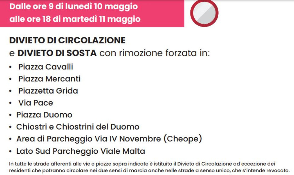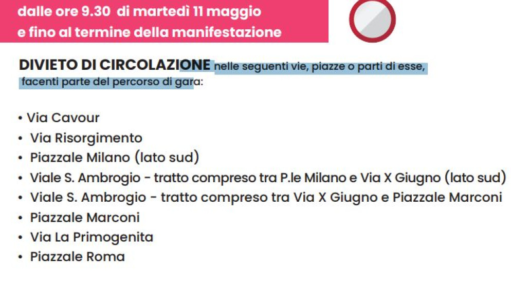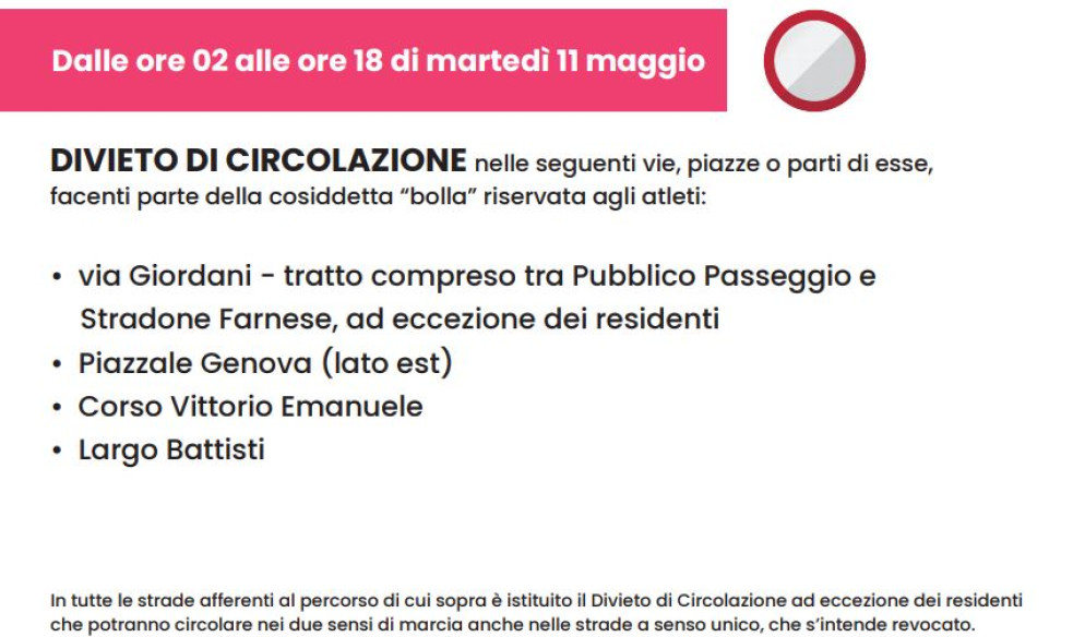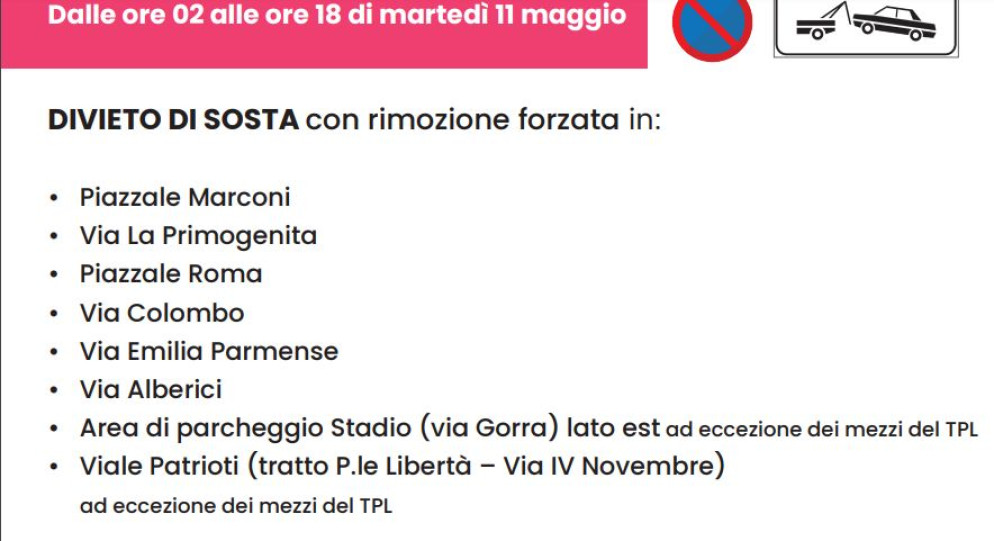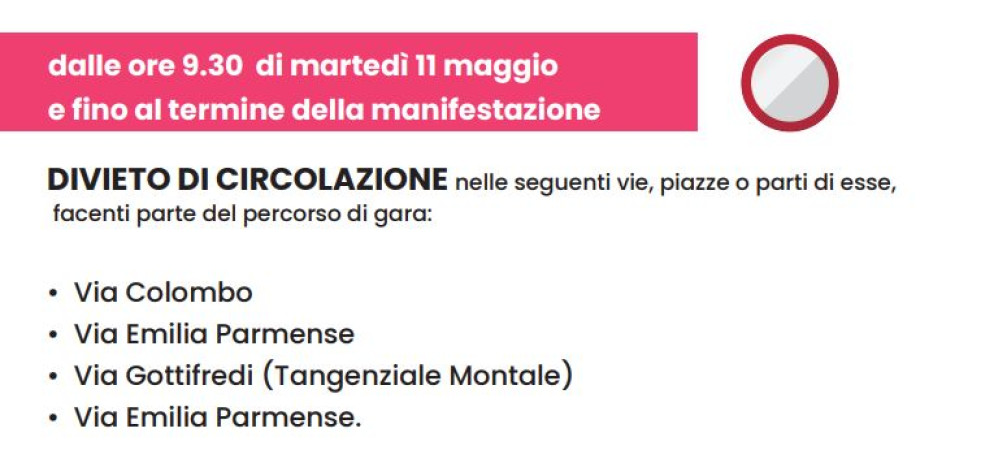 Inoltre, per consentire il passaggio della carovana rosa, nella giornata di martedì via Emilia Parmense (nel tratto che da Piacenza conduce a Cadeo, Pontenure, Fiorenzuola e Alseno) rimarrà chiusa alla circolazione dalle 10.00 alle 13.00 circa. Ad Alseno, in particolare, il tratto di via Emilia interessato dal transito dei ciclisti riaprirà intorno alle 14.00.