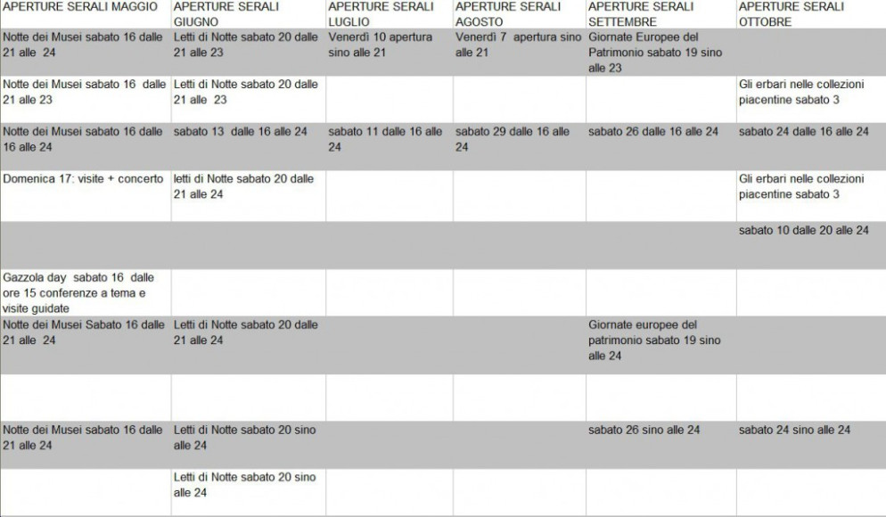 In occasione di Expo 2015 la rete dei musei piacentini, nata nel gennaio scorso, amplierà le aperture dei musei, sia quelle quotidiane sia quelle serali straordinarie in occasione di eventi nazionali (Notte dei Musei, Giornate del Patrimonio, Letti di Notte) o di iniziative organizzate dai singoli musei.