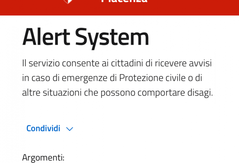 L’Alert system è il sistema automatizzato di cui il Comune di Piacenza si avvale per inviare alla cittadinanza informazioni tempestive in caso di emergenze di protezione civile o altre situazioni che possano comportare disagi rilevanti (ad esempio, limitazioni al traffico di particolare impatto o interruzioni diffuse nelle forniture di luce, acqua o gas), nonché per diffondere avvisi relativi ai servizi pubblici e modifiche alla viabilità in occasione di eventi o manifestazioni sul territorio urbano.