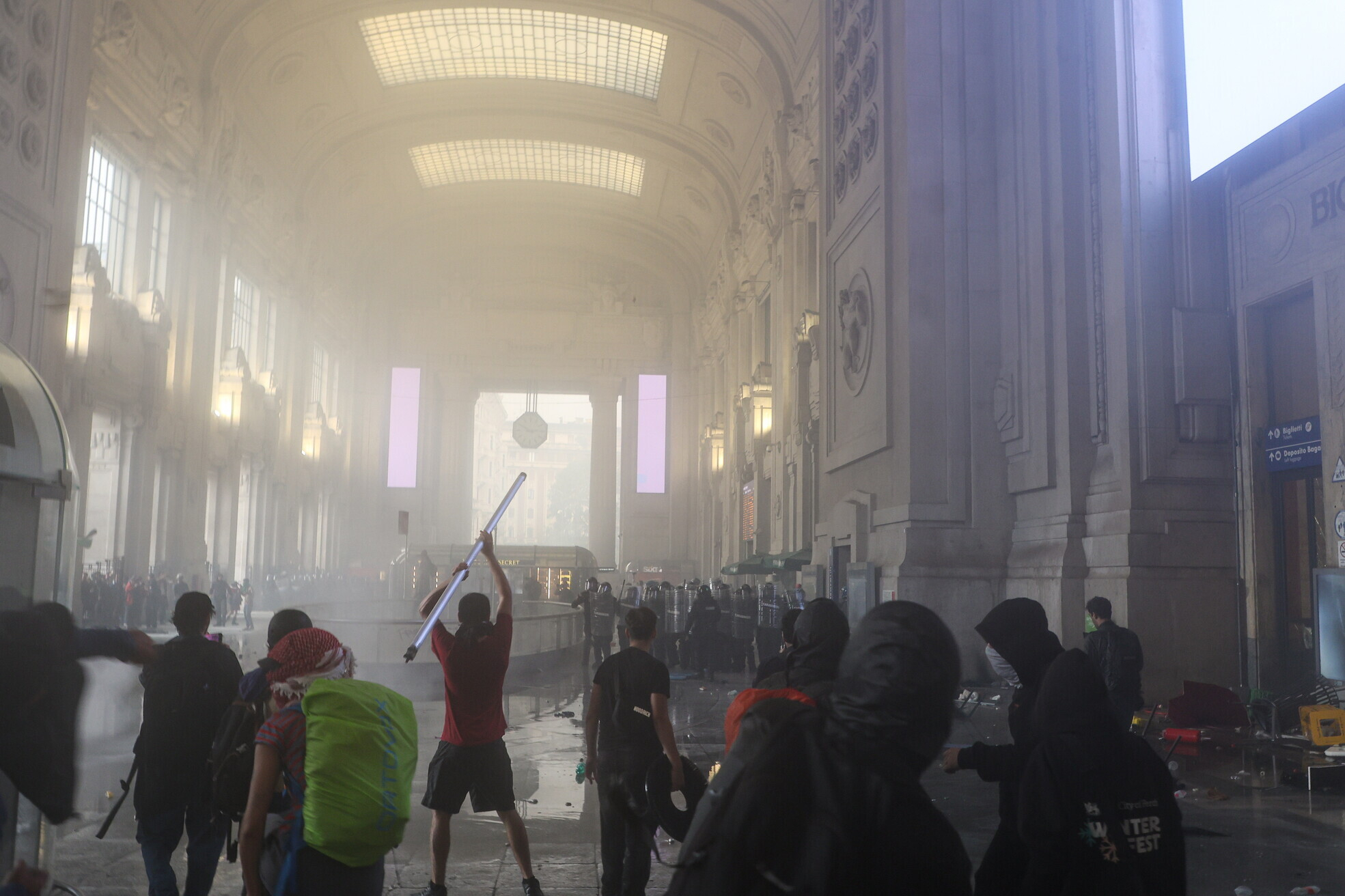 E dire che la giornata era iniziata nel migliore dei modi per gli organizzatori. Nonostante la pioggia torrenziale diverse migliaia di persone si sono ritrovate in piazza Cadorna e altrettanti studenti in piazza Cairoli: dopo essersi fusi in un unico corteo hanno attraversato le vie del centro per raggiungere piazza Duca D’Aosta, di fronte alla stazione, meta finale della manifestazione. Qualche avvisaglia che le cose potessero degenerare si era avuta con le grida “assassini” scandite di fronte al consolato americano e con la bandiera a stelle strisce bruciata, bazzecole in confronto all’assalto condotto in Centrale che ha ricordato le devastazioni compiute dai black block nel centro di Milano l’1 maggio del 2015, il giorno dell’inaugurazione di Expo. Stavolta, per fortuna, i danni sono stati più limitati, con una porta divelta, una vetrata distrutta e l’ingresso della stazione allagato. Sono stati utilizzati idranti, cartelli stradali e persino transenne come corpi contundenti per tentare di crearsi un varco e arrivare ai binari, la polizia ha risposto con manganelli e lacrimogeni. Una piccola guerriglia urbana a pochi metri del Pirellone di Giò Ponti che ha paralizzato l’attività dello scalo già messa a dura prova dallo sciopero: passeggeri e turisti sono scappati nei due lati mentre i dipendenti degli store al piano terra si sono rifugiati all’interno, dove sono stati raggiunti dai gas lanciati in gran quantità dalle forze dell’ordine. Momenti di grande tensione, come hanno confessato alcuni commessi, perché l’assalto è stato violento, con ogni probabilità pianificato: gli aggressori avevano il volto coperto e indossavano felpe nere in modo da rendersi irriconoscibili alle telecamere. Anche le modalità dell’incursione, con centinaia di persone che si muoveva coordinate, rendono più forte il sospetto.