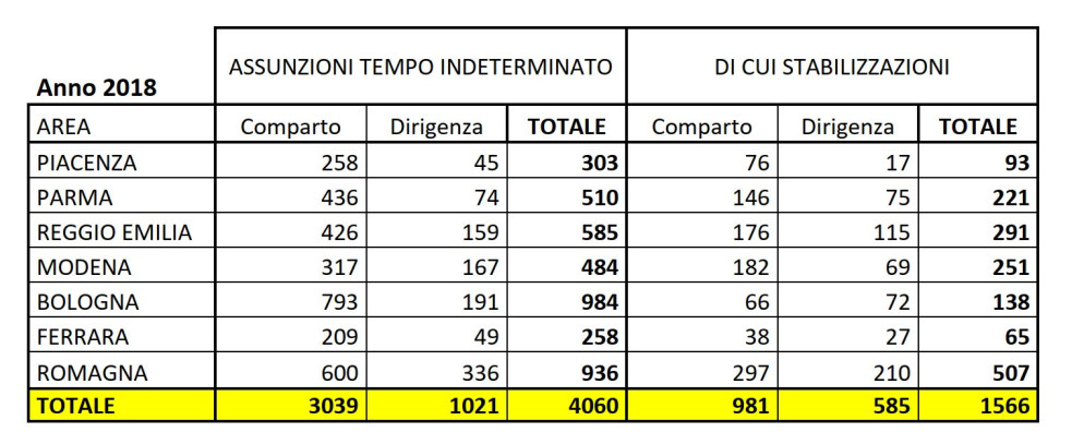 Sono state 303 (su un totale regionale di 4060) le assunzioni nel 2018 nel Servizio sanitario Piacentino , tutte a tempo indeterminato. Di queste 93 sono stabilizzazioni.